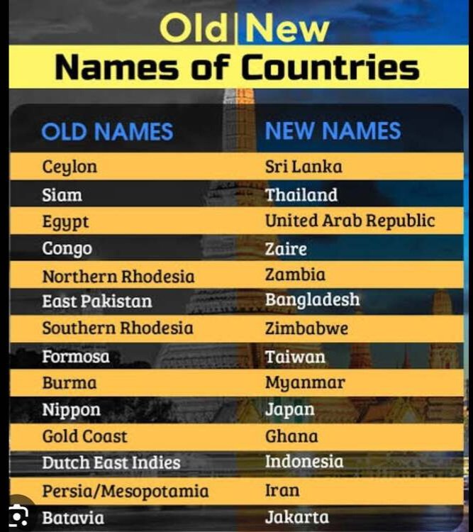1972లో సిలోన్ ద్వీప పేరును శ్రీలంకగా మార్చారు. ఈ పదం సింహళ భాషలో పాతుకుపోయి రిపబ్లిక్ గా ప్రకటించబడింది. శ్రీలంక అంటే సింహాళీ భాషలో ప్రకాశవంతమైన భూమి అని అర్థం 1971లో జరిగిన యుద్ధంలో గెలిచిన తర్వాత పాకిస్తాన్ నుంచి వేరు పడిన ఈస్ట్ పాకిస్తాన్. తన దేశాన్ని బంగ్లాదేశ్ గా ప్రకటించుకుంది.థాయిలాండ్ అంటే స్వేచ్ఛా భూమి. 1939లో సియామ్ పేరును థాయిలాండ్ గా మార్చారు.