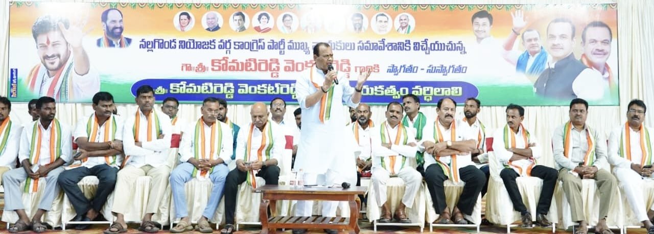 Minister Komatireddy : ప్రజా దీవెన,నల్లగొండ:నల్లగొండ గ డ్డ అంటేనే కాంగ్రెస్ పార్టీకి అడ్డ అని కాంగ్రెస్ కండువా మోసే నిఖార్సై న కార్యకర్తలే పార్టీకి బలమని రాష్ట్ర రోడ్లు భవనాల శాఖ మంత్రి కోమ టిరెడ్డి వెంకటరెడ్డి పేర్కొన్నారు. “మీరే నా లీడర్లు..మీరే నా క్యా డ ర్..మీరే నా బలం,బలగం” అని, “ఏ సమయంలోనైనా తోడుగా నా వె న్నంటే ఉంటూ 30 ఏళ్లుగా నన్ను అక్కున చేరుకున్నారు. ఏమిచ్చినా మీ ఋణం తీర్చలేనిది.” అంటూ ముఖ్యనాయకుల సమావేశంలో భావోద్వేగానికి లోనయ్యారు. మం గళవారం నల్లగొండ నియోజకవర్గ కాంగ్రెస్ పార్టీ ముఖ్య నాయకులతో స్థానిక MNR గార్డెన్ లో విస్తృత స మావేశం నిర్వహించారు.
