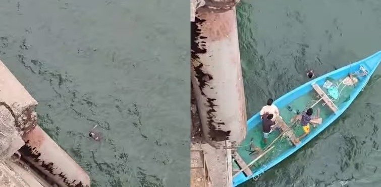 సినిమా స్టైల్లో పడవపై వేగంగా వచ్చి కాపాడిన జాలర్లు