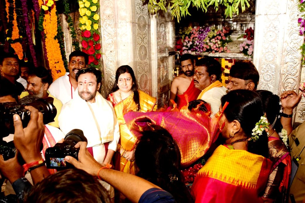కిషన్ రెడ్డి (kisan reddy) దంపతుల ప్రత్యేక పూజలు …సికింద్రాబాద్ ఉజ్జ యిని మహంకాళి అమ్మవారి బోనా ల సందర్భంగా కేంద్ర మంత్రి కిషన్ రెడ్డి దంపతులు ఉజ్జయిని మహం కాళి అమ్మవారిని దర్శించుకుని బోనం సమర్పించారు.ఈ సంద ర్బంగా కేంద్రమంత్రి కిషన్ రెడ్డి మాట్లాడారు మన రాష్ర్టంలో కొన్ని వందల సంవత్సరాల నుండి బోనాల పండుగ సంప్రదాయం కొనసాగుతోందని, దేశంలో ఎక్కడా లేని విదంగా బోనాల పండుగ మన కు మాత్రమే ప్రత్యేకమని పేర్కొ న్నారు. ముఖ్యంగా నగరంలో సికింద్రాబాద్ ఉజ్జయిని బోనాలు మరీ మనకు ప్రత్యేకమని, రాష్ట్రం దేశంలోని అన్ని వర్గాల ప్రజలు సుఖ సంతోషాలతో ఉండాలని మ హంకాళి అమ్మవారిని కోరు కున్నానని చెప్పారు.