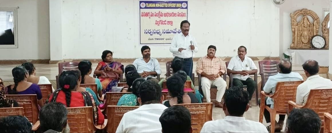 తెలంగాణ వసతి గృహ సంక్షేమ అ ధికారుల సంఘం సర్వసభ్య సమా వేశం గురువారం టిఎన్జీవోస్ భవన్ లో నిర్వహించడం జరిగింది. ఈ సమావేశానికి ముఖ్య అతిథిగా వి చ్చేసిన టిఎన్జీవోస్ జిల్లా అధ్యక్షు లు నాగిళ్ల మురళి మాట్లా డుతూ నూతన వసతి గృహ సంక్షేమ అధి కారులందరూ సభ్యత్వం నమోదు చేసుకోవాలని, మరియు రెవిన్యూ డివిజన్ల వారిగా కమిటీలు ఏర్పాటు చేసుకొని సమస్యల పరిష్కారానికి కృషి చేయాలని తెలియజేశారు. న ల్లగొండ జిల్లా నందు ఉన్న ప్రతి వ సతి గృహసంక్షేమ అధికారి బడుగు బలహీన వర్గాల పేద పిల్లల కోసం నిరంతరం కృషి చేస్తూ వాళ్ళ అ భ్యున్నతికి ఎంతో తోడ్పడుతున్నా రని కొనియాడారు.